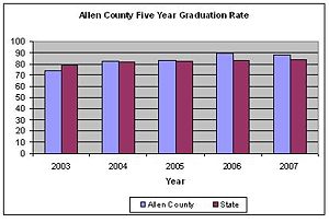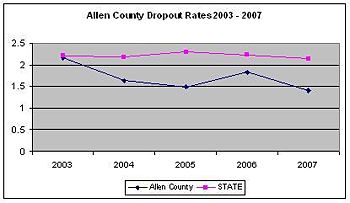 There is only one high school in Allen County Public school system, Scottsville High School. Therefore, Scottsville High School graduation rate is in fact, the county's graduation rate. The chart in Figure 1 shows five year graduation rates alongside the state graduation rates. The chart in Figure 2 above shows dropout rates for Allen County Public Schools from 2003 to 2007. Although Allen County had a slight increase in dropout rates in 2006 the county has consistently been better than the state average, falling below the state average rate for the five years.