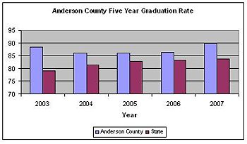 The graduation rate for Anderson County Public Schools is the same as the graduation rate for Anderson County High School, the only high school in the county. Figure 1 shows the five year graduation rate for Anderson County High School alongside the state graduation rate. Anderson County Public Schools' dropout rates as shown in Figure 2 have been lower than the state average average for five years from 2003 to 2007 even though there was an increase between 2004 and 2006.