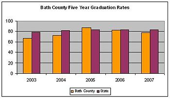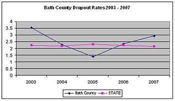 Bath County graduation rates are a reflection of Bath County High School graduation rates as it is the only the high school in the county school system. Figure 1 shows a comparison of Bath County school system graduation rates against the state average graduation rates for a five year period. Figure 2 above shows a comparison of dropout rates between the state average and Bath county public school system from 2003 to 2007. Between 2003 and 2005, the county recorded performance improvements showing declining dropout rates. But 2006 and 2007 realized a decline in performance thus recording increases in the dropout rates.