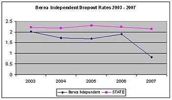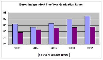 There is one high school in the Berea Independent school system, Berea Community High School. The graduation rates for the Berea Independent school system are shown in the chart in Figure 1 with the state average graduation rates for five years, 2003-2007. Figure 2 shows Berea Independent school system's dropout rates between 2003 and 2007. The school system recorded its lowest dropout rate in 2007.