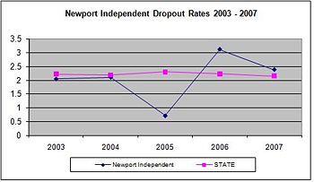 Figure 1 shows graduation rates for Newport Independent school district for a five year period 2003 to 2007 alongside state average graduation rates. From the chart, it is evident that Newport Independent school district recorded a decline in graduation in 2004. Note that there is only one high school in Newport Independent school district, Newport High School. The district's graduation rates are in fact graduation rates for Newport High School. Figure 2 shows dropout rates for Newport Independent for the five years from 2003 to 2007 alongside the state average dropout rate.