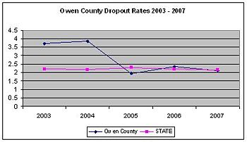 The chart in figure 1 shows graduation rates for Owen County public school district in comparison with the state average graduation rates for a five year period, 2003 to 2007. The data shows that Owen County public school district continues to perform below the state average graduation rates. Note that there is one high school in Owen County public school district, Owen County High School, therefore the county's graduation rates reflect Owen County High School graduation rates. Figure 2 shows dropout rates for Owen County for the five years from 2003 to 2007 alongside the state average dropout rate.
